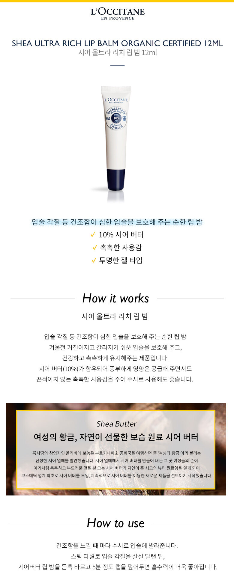 ■구성 : 시어 울트라 리치 립 밤 튜브 12ml-식물성 왁스가 혼합된 시어 버터(10%)가 함유되어 있어 입술을 보호하며 부드럽고 매끄럽게 가꾸어 줍니다. 입술이 건조하거나 자주 트는 남녀 모두를 위한 립 밤으로 튜브형으로 되어 있어 언제 어디서나 편리하게 사용할 수 있습니다.