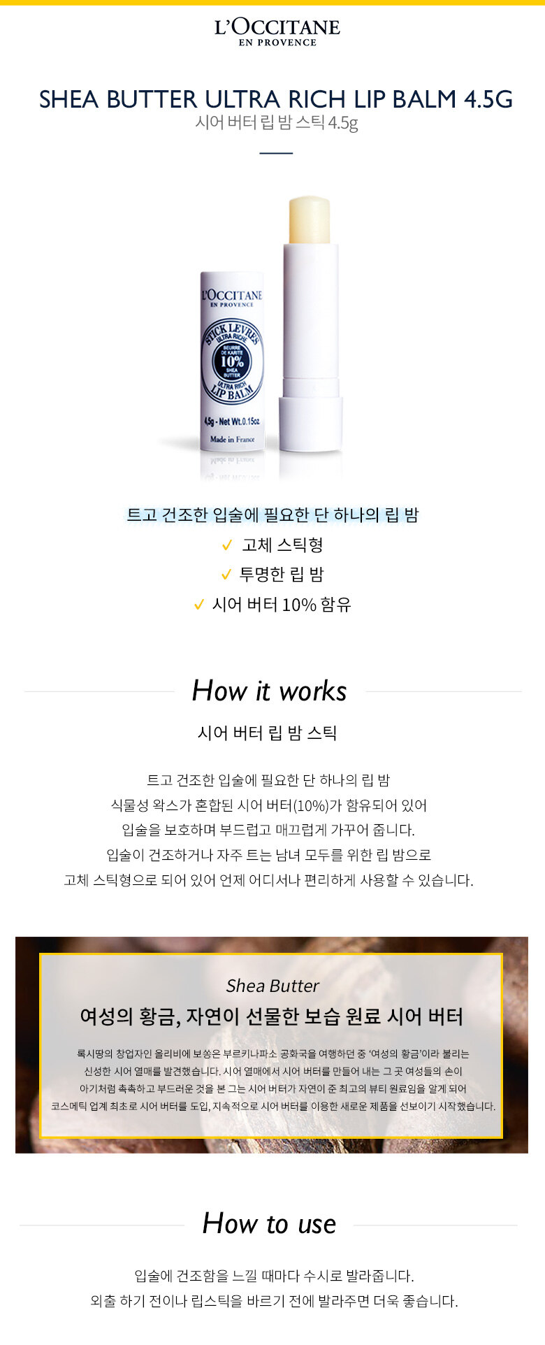 ■구성 : 시어 버터 립 밤 스틱 4.5g + 미니사셰 케이스-식물성 왁스가 혼합된 시어 버터(10%)가 함유되어 있어 입술을 보호하며 부드럽고 매끄럽게 가꾸어 줍니다. 입술이 건조하거나 자주 트는 남녀 모두를 위한 립 밤으로 고체 스틱형으로 되어 있어 언제 어디서나 편리하게 사용할 수 있습니다.