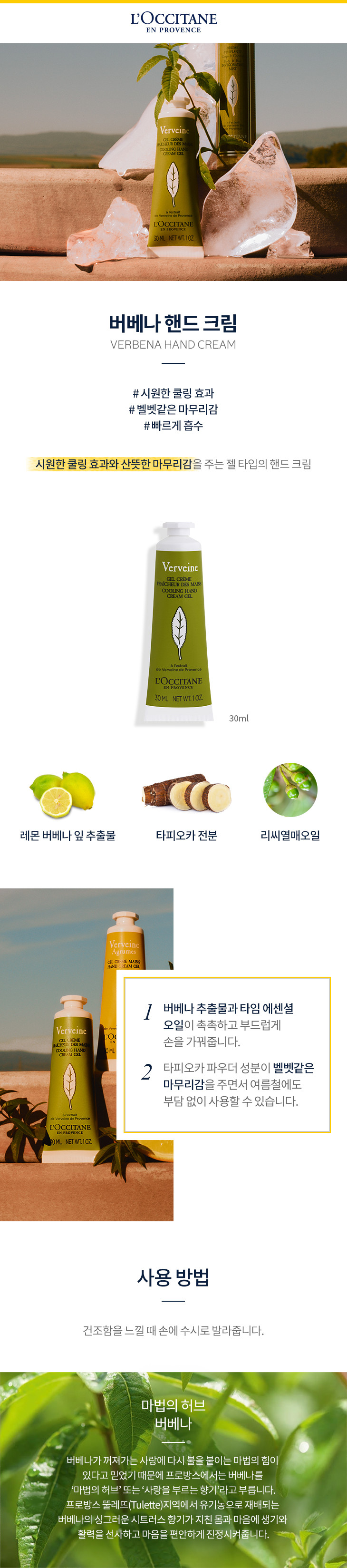 ■구성 : 시어 버터 핸드 크림 30ml + 버베나 핸드 크림 30ml + 미니사셰케이스<시어 버터 핸드 크림>- 풍부한 시어버터의 보습, 글로벌 베스트 핸드크림!- 시어 나무의 너트에서 얻은 20%의 오리지널 시어버터가 풍부한 보습 장벽을 강화해주고, 유채꽃 프리바이오틱스가 함유되어 건강하고 탄력 있는 손으로 가꾸어줍니다.- 오리지널 시어버터의 파우더리 머스크향과 피부에 스며들 듯 녹아드는 감각적인 멜팅 텍스쳐가 특징입니다<버베나 핸드